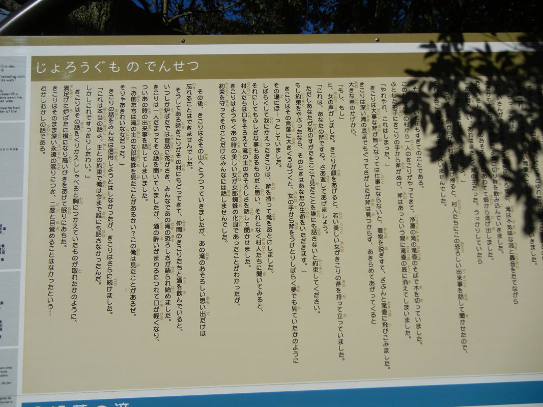 ![]() 浄蓮の滝の近くに住む青木某と言う農夫が、滝の近くの畑を耕していた。 日がやや斜めになった頃、腰を下ろして煙草を取り出した。 その時、一匹のたくましい女郎蜘蛛が彼の足の上にはい上がってきて、一條の太い糸をひいて去った。 蜘蛛は糸をひいては去りを繰り返し、気が付くと無数の糸が足を巻いていた。 彼はその糸を手近な桑の古株に巻き付けた。 そして休憩を終えて立ち上がったその時、嵐のような滝の響きが聞こえ、大地が怪しく揺れたと思うと、桑の古株がめりめりと抜け、滝壺の中に飲み込まれていった。 彼は危うく命を落とすところだった。 それから数年後、一人の樵が滝の古木を伐っていた際、過って鉈を滝壺に落としてしまった。 すると、妖艶な若い女が岩陰から半身を現して、片手に樵の落とした鉈を握っていた。女は「あなたの落とした鉈は返してあげますが、私のことを口外すると命はありませんよ。 私はこの淵の主の女郎蜘蛛…」と言った。 樵は自分の見た怪異について一言も語らないでいたが、ある冬の夜、酒を飲んでいて思わず話してしまった。 その夜、樵は忽然とあの世へ旅立ってしまった。 それ以来、里人は女郎蜘蛛の精に怖れを感じて、決して滝に近づかなかったと言う。 ![]() 遠目に見る浄蓮の滝と遊歩道入口にある説明板