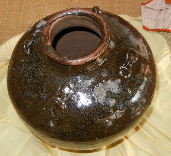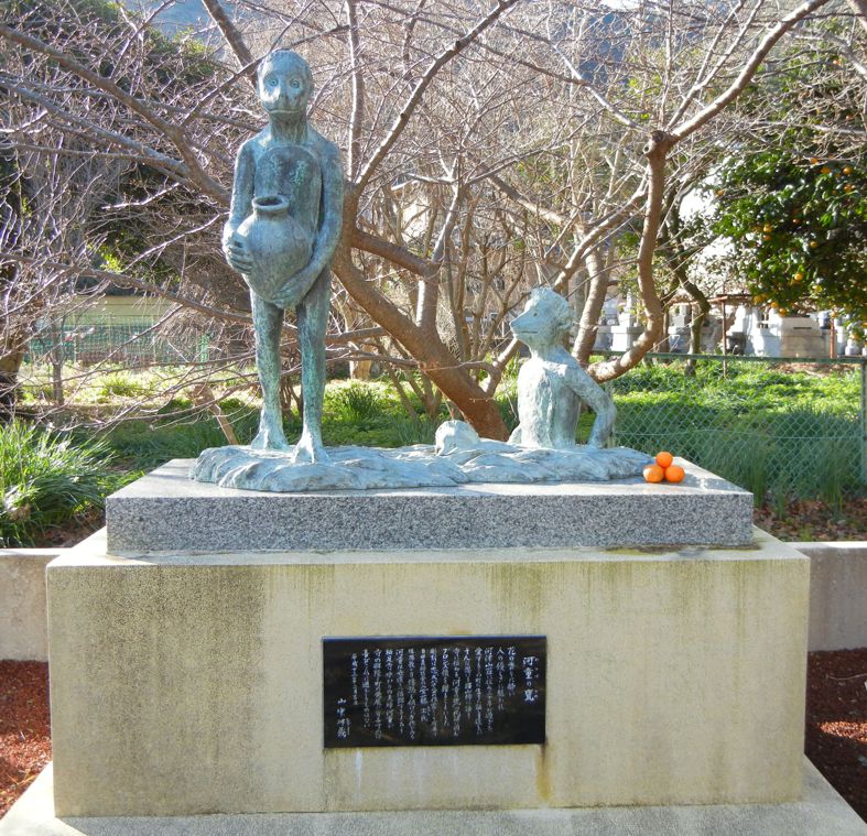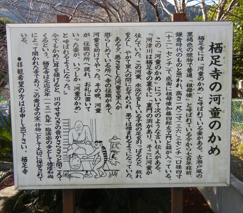 ![]() 栖足寺の裏手に、河津川の裏門の淵があってそこに河童が棲んでいた。 河童は水浴びしている子供の足を引っ張るなどの悪さをしていた。 6月の田植え時のある日の夕方、馬に悪さをした河童が里人に捕まり、殺されそうになっている所へ栖足寺の住職がやって来て河童を助けてあげた。 するとその晩、住職のもとに河童が現れ、お礼にと壺を置いていった。 それは、耳をあてると川のせせらぎの音がサラサラと聞こえてくる不思議な壺だった。 この壺がいつしか"河童のかめ"と呼ばれるようになり、今でも寺宝として残されている。 [補足] ・かめの底面には「祖母懐加藤四郎左衛門」と書かれています。 祖母懐とはこの辺りの池の名で、鎌倉時代、そこでとれた陶土で作られた焼き物だそうです。 ・河童に驚いて飛び上がった馬の蹄の跡が付いたとされる石が河津川にあったそうですが、狩野川台風の際に流されてどこかにいってしまったとのこと。 ・河童が捕まりそうになって逃げようとした井戸もあるそうですが、一般人が見れる場所にはないそうです。 ![]() これが"河童のかめ" ここに耳をあてると川の音が…たしかに聞こえました!!
