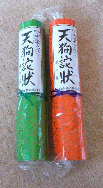 ![]() 万治元年(1658年)の頃、柏峠に毎夜天狗が出没して悪さをし、旅人を悩ましていた。 そこで、仏現寺(佛現寺)の日安和尚が峠に赴き、7日間祈祷し、満願の日に峠の巨木を伐らせた所、松の梢に巻物が掛かっているのを発見した(空から巻物が落ちてきたとも)。 その巻物に書かれている文字や書体は判読できないが、おそらく天狗の侘び証文であろうと言い伝えられている。 [補足] 証文は、朝鮮の古文書であるとか、足利時代の僧侶が好んで書いた書風にならって日安上人が自ら書いたものであろうなどの説があるが、未だこれを通読できず、判明していない。 伊東市内から柏峠へ向かうハイキングコース中に、"馬場の平"と言う所があります。以前はここに、天狗の詫び状が置かれた場所の目安として小さな石塔があったそうですが、今はありません。 本物の詫び状は基本的に非公開ですが、佛現寺にあるお土産「天狗詫状 煉羊羹」の掛け紙の裏側に詫び状の一部がコピーされています。