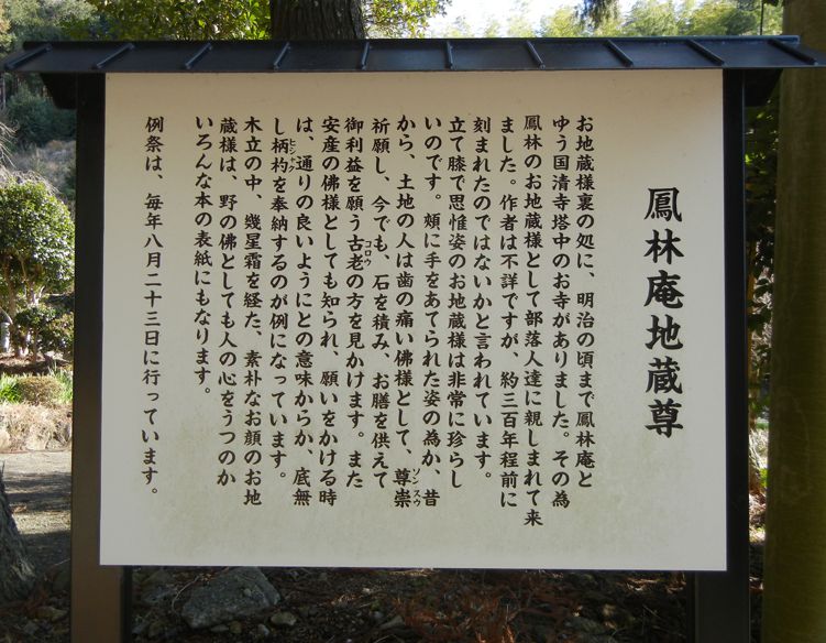 ![]() 蔓延元年(1860年)三月、石井一兆と言う子坊が奈古谷の国清寺に泊まっていた。 夜中、厠に行って戻ってくる途中、暗がりから黒い怪物が現れ、一兆を捕え、矢のような速さで空を飛んで行った。 数分後、一兆は広野の中に立っていた。そして「小僧、天狗になれ」と幾人もの声がした。 一兆は「許して下さい。天狗になるのは嫌です」と声を限りに泣き叫んだ。 すると天狗は「臆病者!それなら目をつぶれ。寺へ返してやる」と言った。 その頃、国清寺では一兆がどこにもいないと大騒ぎになっていた。 国清寺の住職は僧侶を集め、祈祷をして神隠しの解けることを祈った。 三日目の真夜中、釈迦堂の屋根の上で「ただ今帰りました」と声がした。 住職が寺男に提灯を持たせて外へ出てみると、屋根の上に一兆が震えて立っていた。 [補足] 一兆は、後に奈古谷高岩院の住職となり、明治44年5月、65歳で亡くなられたそうです。 国清寺の敷地内には、立膝で考え事をしている珍しいお地蔵様があります。明治の頃まで国清寺塔中に風林庵と言うお寺があり、"風林のお地蔵様"として親しまれていたそうです。 ![]()