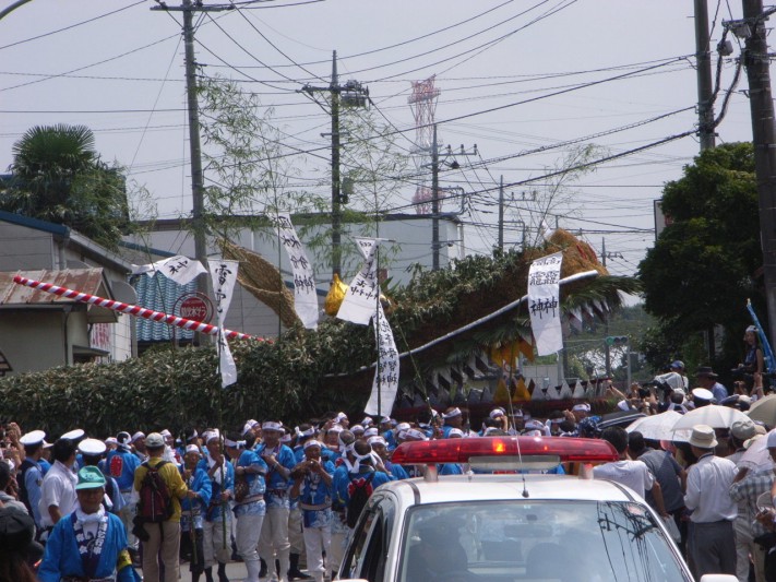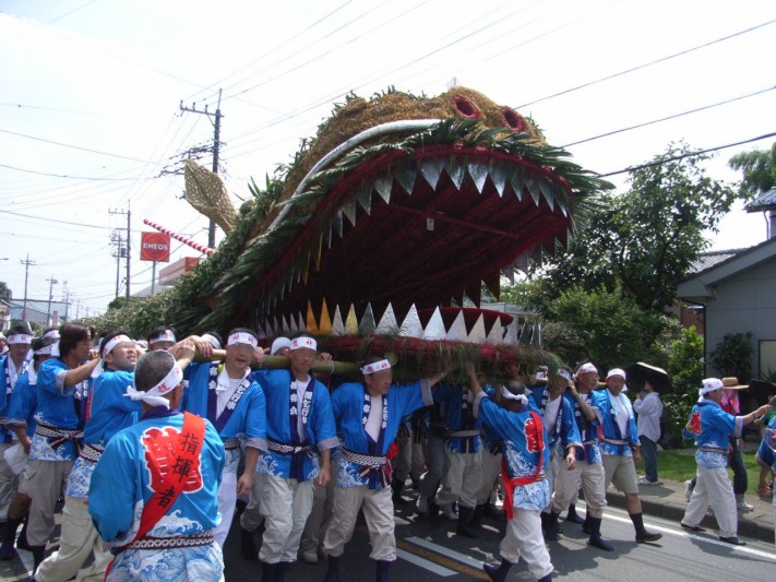 ![]() 江戸時代から伝わる降雨祈願で、雷電池のほとりにある脚折雷電社の前で雨乞いを祈願すると必ず雨が降ったと記録されています。 しかし、ある時、この池を縮めて田としてしまったため、雷電池に住んでいた大蛇が群馬県板倉にある雷電の池に移ってしまい、雨が降らなくなり、干ばつが続きました。 明治7年、干ばつに困った脚折の村人が板倉雷電社に行き、神官に一晩中降雨を祈願してもらい、池の水を竹筒に入れて持ち帰りました。その水が脚折の雷電社に到着したとたん、雲が出て、まもなく雨が降ったとされています。 現在では、国選択無形民俗文化財・鶴ヶ島市指定無形文化財に指定され、四年に一度、オリンピックのある年に行われています。 雨乞行事は、竹と麦わらで作られた長さ約36m,重さ約3tの「龍神」を300人ほどの男衆が白鬚神社から雷電池までの約2kmを担いで練り歩き、最後に雷電池に入って、龍神を昇天させます。 ![]() ゲゲゲの雨乞龍蛇おやじ © 水木プロダクション |