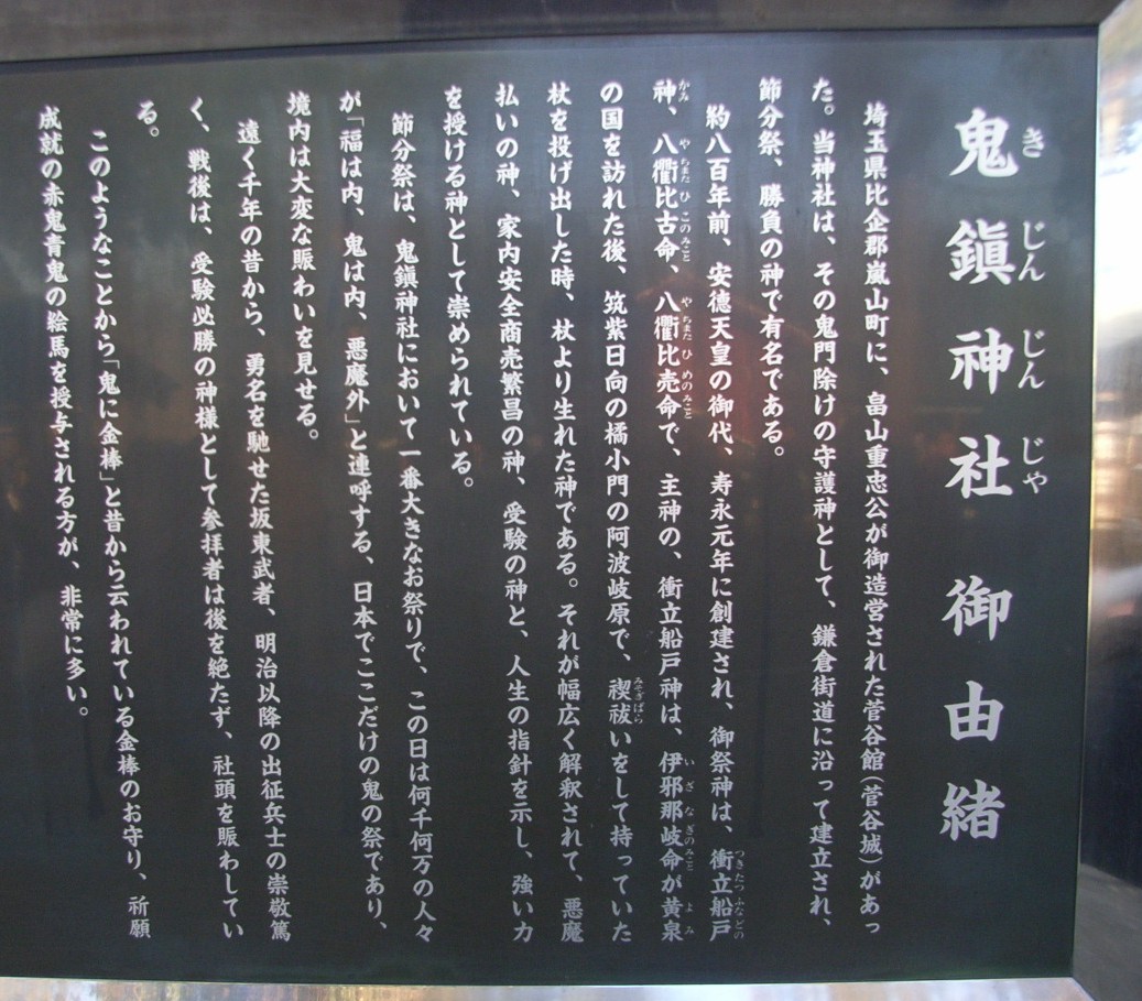 ![]() 嵐山町には、全国でも珍しい鬼を守護神として祀った鬼鎮神社があります。 2月3日に鬼鎮神社で行われる節分祭では、豆まきの掛け声は「福は内、鬼は内、悪魔外」と言い、赤鬼と青鬼も白装束で登場します。 鬼を祀ったのは、畠山重忠が菅谷城を築城する際に、鬼門除けのためと言われていますが、下記のような伝説が語られていた由来もあります。 むかし むかしのお話です。 川島に、刀を造る鍛冶屋さんが住んでおりました。朝から晩までトンテンカン トンテンカンと刀を造っていました。とても立派な刀が出未るので、評判がよくなり多勢の侍たちが買いに来るようになりました。 或る日、若い男がやって来ました。「僕、刀がつくりたいのです。教えてください」と鍛冶屋さんに頼みました。鍛冶屋さんも弟子を持ちたいと思っていた時ですから「よしよし」と承知しました。若い男はとても熱心で、休み時間も休まずに、夜もおそくまで一生懸命刀つくりをするのでよい刀ができるようになりました。何年か過ぎた時は、もう立派な刀鍛冶になりました。 この鍛冶屋のお家には、美しい女の子がおりました。だんだん大きくなって立派な娘さんになりました。若い男は、鍛冶屋の主人にその娘さんを僕のお嫁さんにくださいとたのみました。主人は少し考えて「それでは、ひと晩に刀を百本作ったらあげよう」といいました。若い男は喜んで準備して約束の日を待ちました。 約束の夜になりました。トンテンカン トンテンカンと刀をつくる音が休みなしに響いてきます。みるみるうちに、三本 五本とできていきます。夜も遅くなりました。主人は心配してそっと鍛冶場をのぞきました。できました できました できたばかりの刀が山のように積まれていました。けれども驚いたことには、刀をつくっている若い男はいつもの男ではありません。まるで鬼です。トンテンカン トンテンカンと打つ槌(つち) も火を散らしてその辺は火の海です。するどい眼、頭には角まで生えております。何本かの手は次々にできた刀を積んでいます。主人は「アッ」と飛び出しました。そして、あの男にかわいい娘をくれられない、それには、にわとりを鳴かせて早く夜があけなくてはと考えて、おお急ぎでとり小屋へ走りました。ココケッコーにわとりが鳴きました。主人は、又のぞきに行きました。鬼になった男はまだ刀を造っています。けれどもそのうちに東の空が明るくなって夜が明けてきました。 刀は九十九本できていました。鬼の男は、槌を握ったまま倒れています。側へ寄って見ると死んでいました。主人は涙がとめどもなく流れてきました。なくなった男を抱きあげて外へ出ました。そして庭の遇へ埋めて鬼鎮様というお宮をつくりました。 (『嵐山町史』昭和58年刊 嵐山町)より抜粋 |